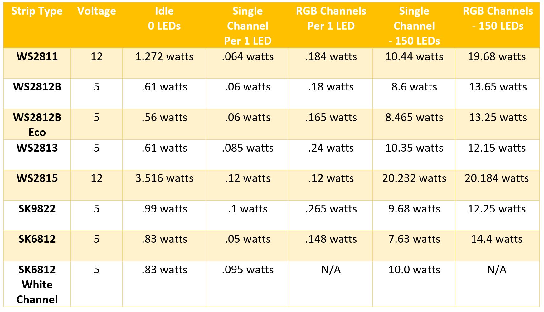 - WS2812B LEDs are have much higher power usage over a certain distance - 18 Watts max (~3.5 Amps @ 5V for 60 LED / meter strips) per meter! The max rating is assuming all the LEDs are on full white, usually the actual current for colorful design is about 1/3 to 1/2 the max current. A good power supply such as a 5V 10A supply is key! For 5 meters of 30 LED/meter strip the recommended power supply is DC5V 10A!