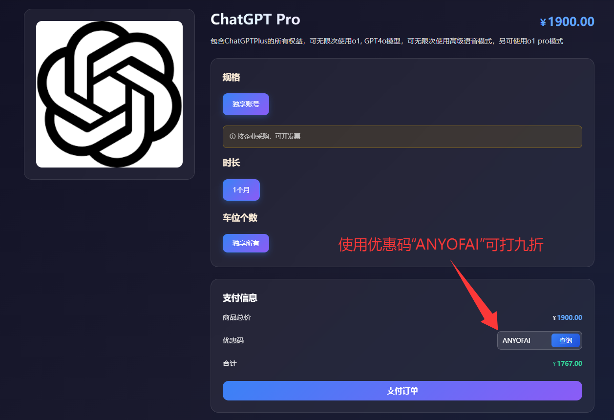你也可以通过星际放映厅购买ChatGPT Pro原生独立账号,现在使用优惠码“ANYOFAI”也可以享九折优惠,每月仅需1767元。