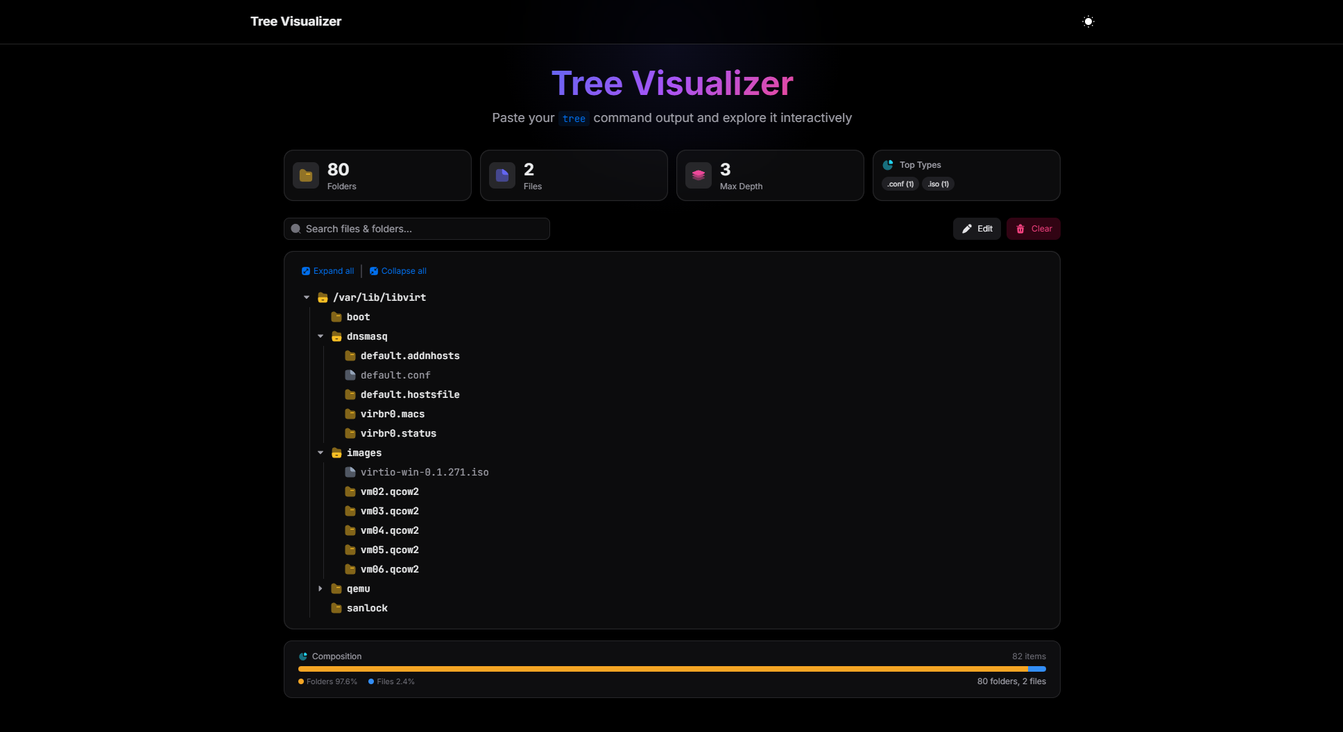 treecommand (Linux/macOS/Windows) and get an instant visual representation - Interactive Tree — expand/collapse folders, with smooth animations