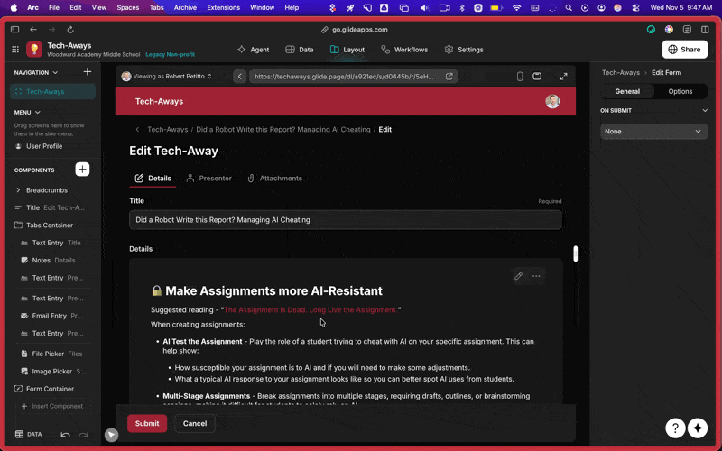 When users write or edit long-form text, the formatting toolbar remains anchored at the bottom of the component. For large blocks of text, users must repeatedly scroll down to the bottom to access formatting tools (bold, italics, bullets, etc.), breaking the writing flow and reducing usability.