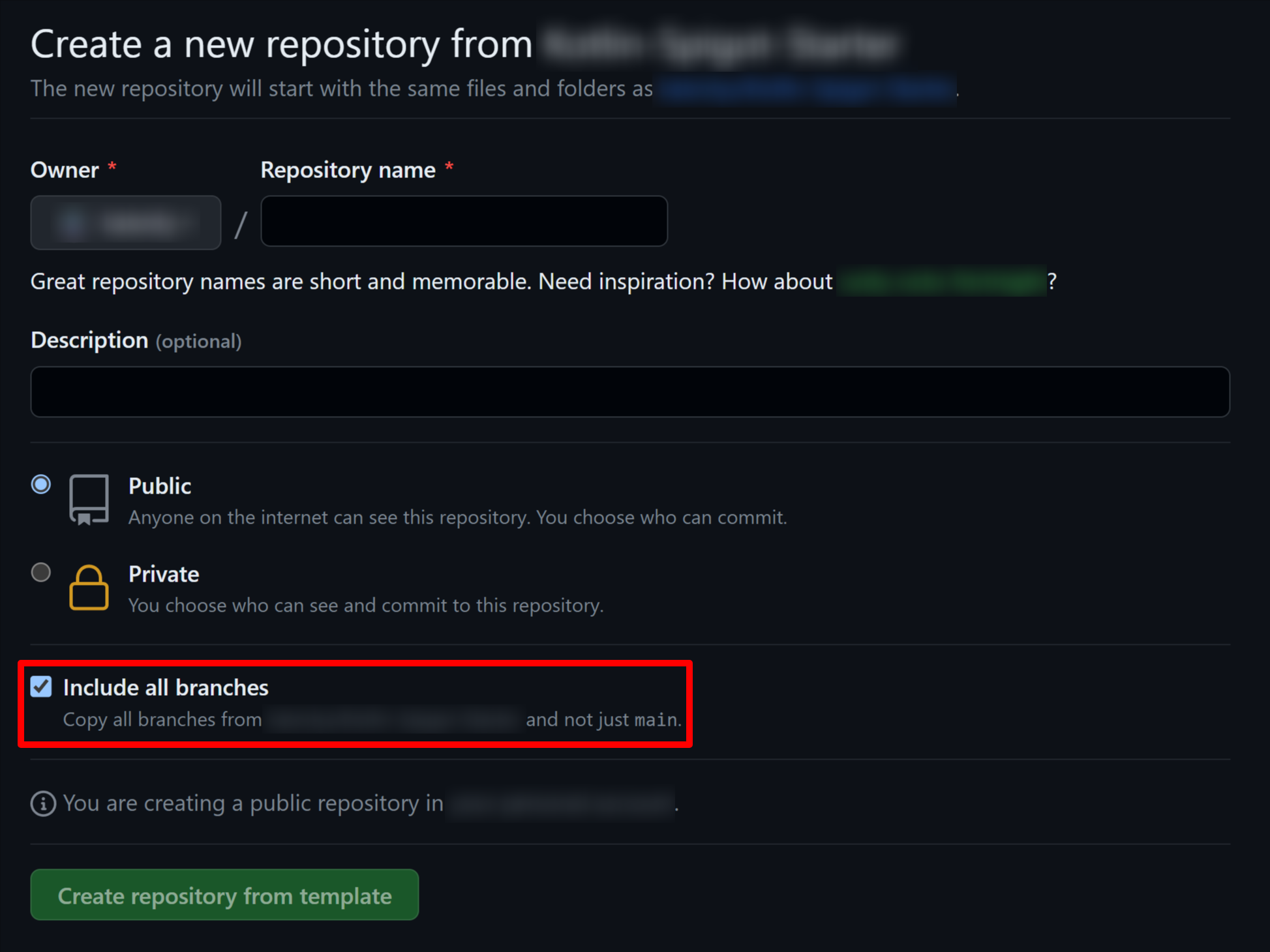 - Click "Use this template", and then create a new repository. Please select "Include all branches" to include the branch that stores CLA signatures, or else you can't use the CLA feature.