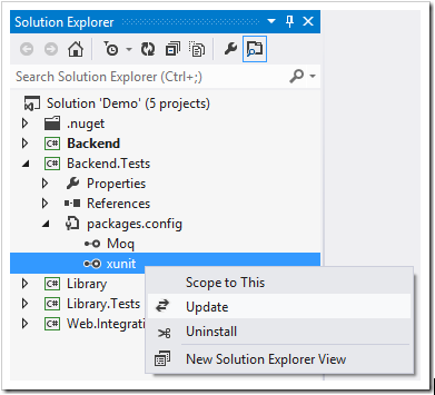 And update/uninstall can be performed right from the node in the Solution Explorer window: