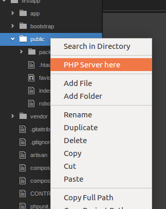 php-server:start— Start / Restart PHP server from project pathphp-server:start-tree— Start / Restart PHP server from folder/file selected in treephp-server:start-document— Start / Restart PHP server from currently open filephp-server:stop— Stop running PHP serverphp-server:clear— Clear message panel