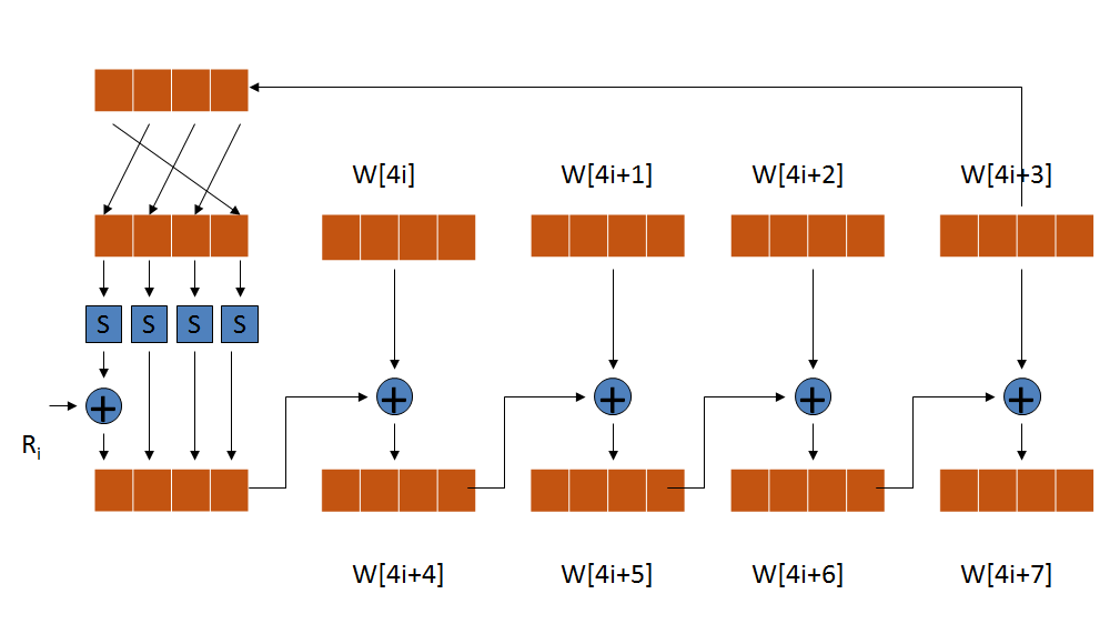 state: 89 d8 10 e8 85 5a ce 68 2d 18 43 d8 cb 12 8f e4密钥扩展算法是Rijndael的密钥编排实现算法,其目的是根据种子密钥(用户密钥)生成多组轮密钥。轮密钥为多组128位密钥,对应不同密钥长度,分别是11,13,15组。