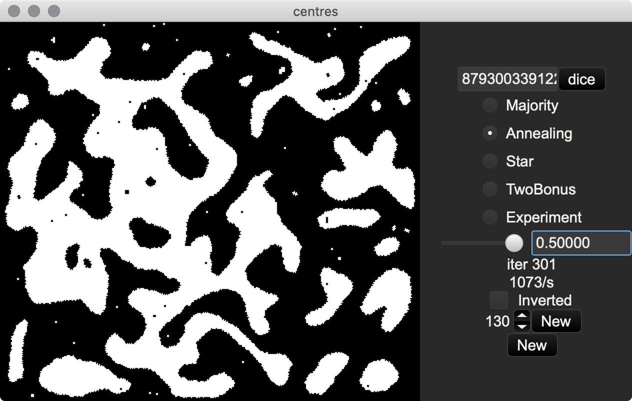 Experiments with cellular automata This program grows images starting from random noise, using simple rules about neighbours. It uses Druid, a cross-platform GUI library. It's a work in progress experiment, code is fairly roughly edited.