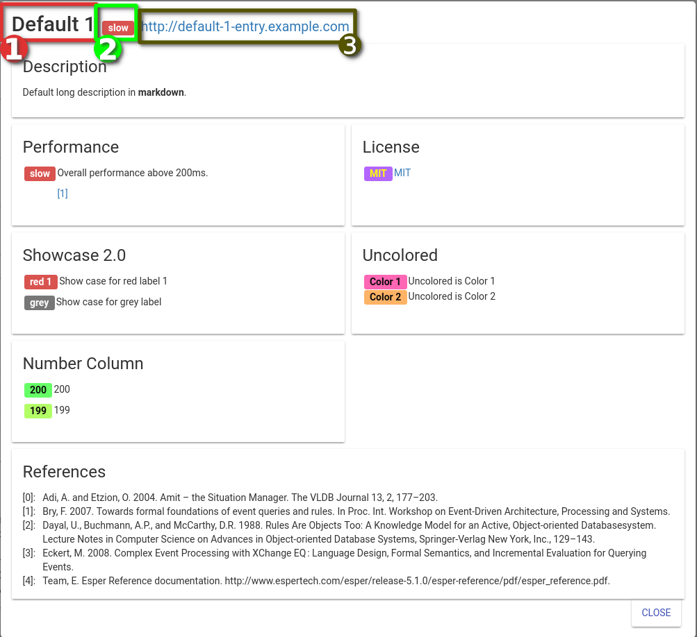 criteria: List of fields that all comparison elements use. The attributes for each criteria are:name: The display name of the criteria. Type:string(1)search: Whether a text box should be added to the search form. Allowed values:true(1),falsetable: Whether it should be included in the comparison table by default. Allowed values:true(2),falsedetail: Whether it is in the detail page. Allowed values:true,falsetype: The content type of the field. Allowed values:url,markdown,text,label,rating,repositoryandSearch: Whether the search should be match all (true) or match one (false). Allowed values:true(3),false(3)values: All allowed values the field can assume. Values can have the following attributes:description: Part of the tooltip for every instance of the value. Type:stringclass: CSS-class of the label. Type:string(label-only)backgroundColor: The background color of the label. Applies only if no class is given. Type:string(label-only)color: The text color of the label. Applies only if no class is given. Type:string(label-only)minAge: The minimum age of the last commit to apply this value. Type:number(repository-only)minAgeUnit: The unit to apply to the minAge attribute. Allowed values: https://momentjs.com/docs/#/durations/as-iso-string/ (repository-only)maxAge: The maximum age of the last commit to apply this value. Type:number(repository-only)maxAgeUnit: The unit to apply to the maxAge attribute. Allowed values: https://momentjs.com/docs/#/durations/as-iso-string/ (repository-only)